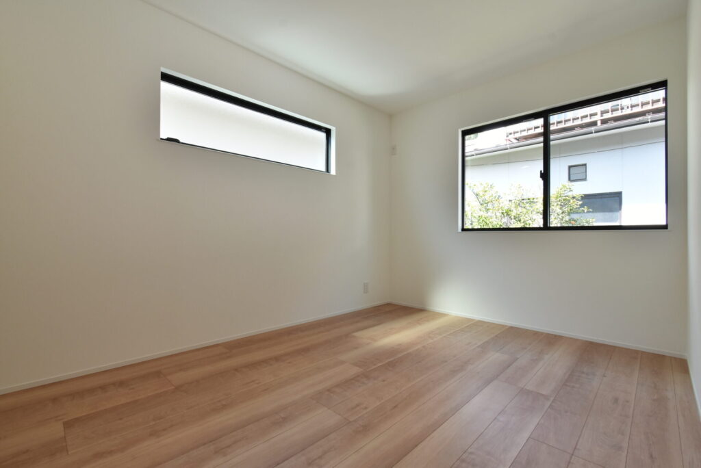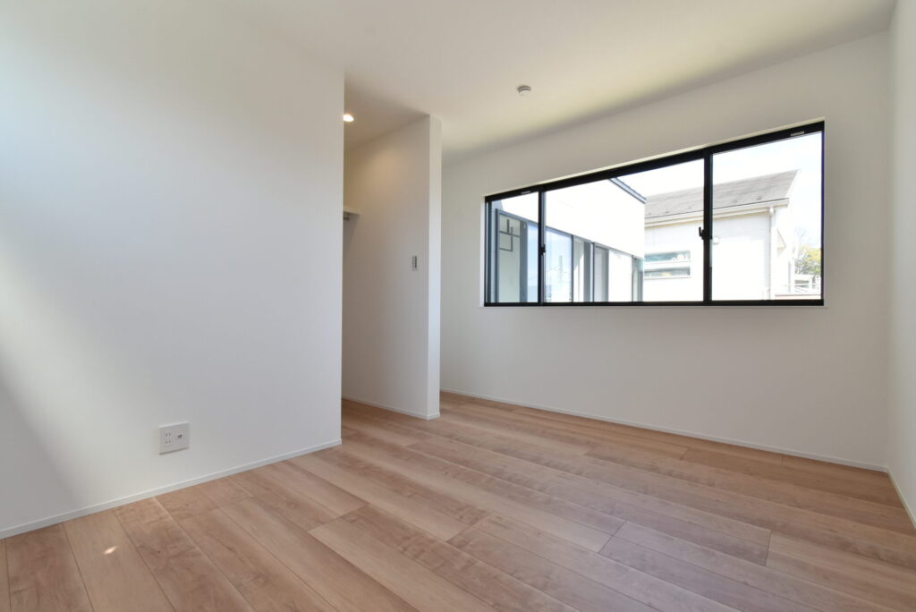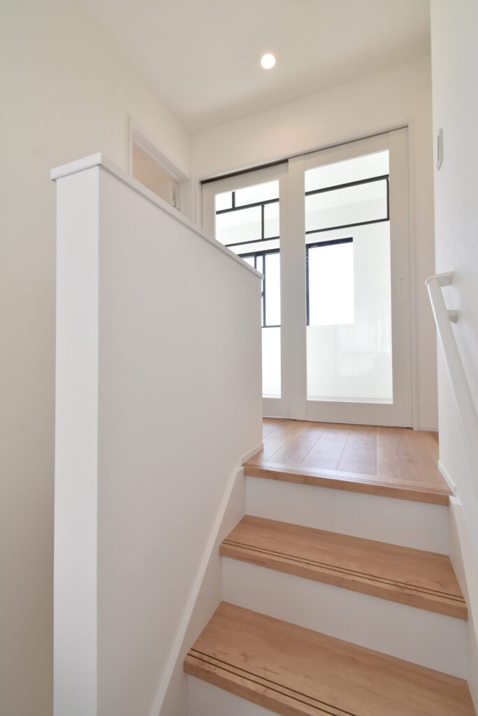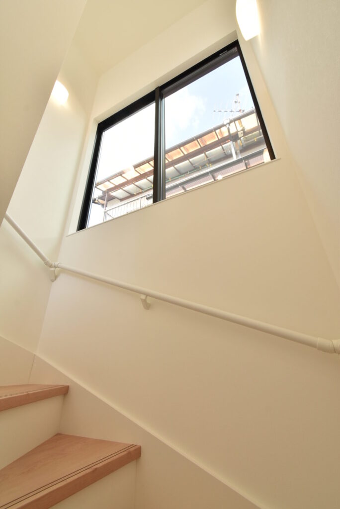 階段を上がると見えてくるのが、開放感のある大きな窓。青空も見えて気持ちのよい窓なのですが、窓のすぐ向こうにお隣のお庭があるので、ブラインドやカーテンが必須となりそう。