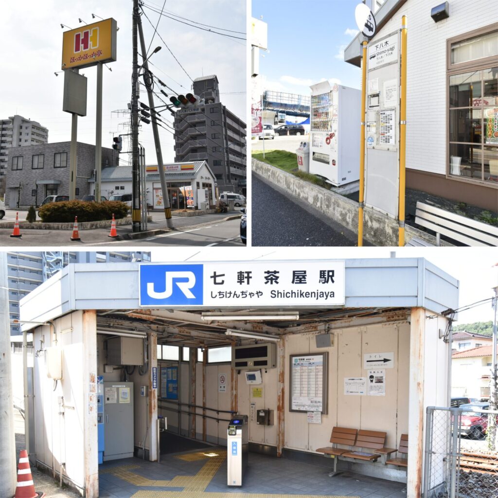 最寄りの公共交通機関は、左上・「ほっかほっか亭下八木店」(約550m 徒歩7分)の真正面にある、/右上・「下八木バス停」(約550m 徒歩7分)です。広島バスセンターや八丁堀を経由し、広島駅まで向かうバスが到着します。本数が多いので通勤に助かります。/下・「JR七軒茶屋駅」(約1.1km 徒歩14分)も徒歩圏内です。
