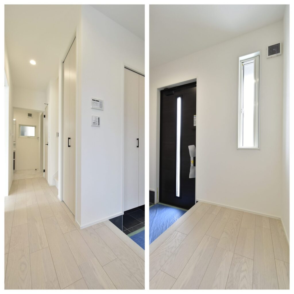 玄関ドアとスリッド窓の2か所から日が差し込み、明るい玄関。廊下には収納がありました。