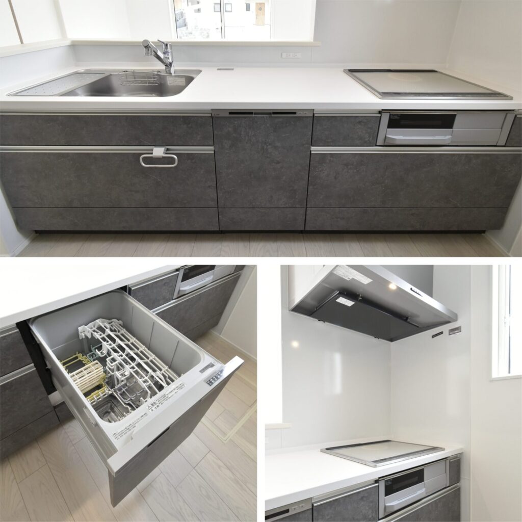 上・浄水機能付きの水栓なので、美味しいお水を料理に使えます。また作業台には、コンセントがあり、ハンドミキサーや電気鍋が利用しやすく、料理が捗ること間違いなし♪/左下・洗い物の片付けは、食洗機にお任せし、家事の負担軽減へ。/右下・壁面はマグネットが使用できるパネルなので、浮かせる収納が叶います。またパネルは、サッと拭き掃除だけで汚れが落ちやすく、掃除がラクな点も助かります。