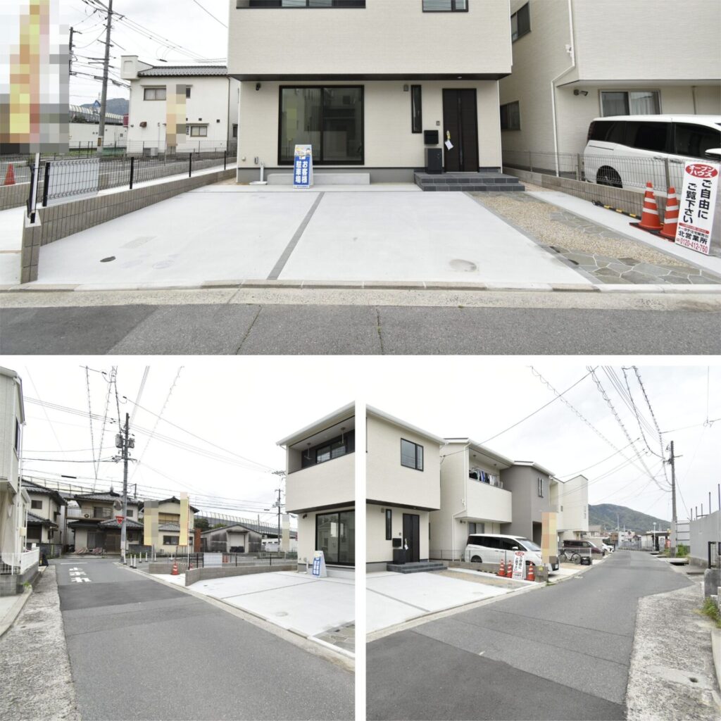 駐車スペースは、車2台+バイク・自転車が止められる余白のある広さ。前面道路の幅は約4m。交通量はさほど多くなく、静かな印象を受けました。