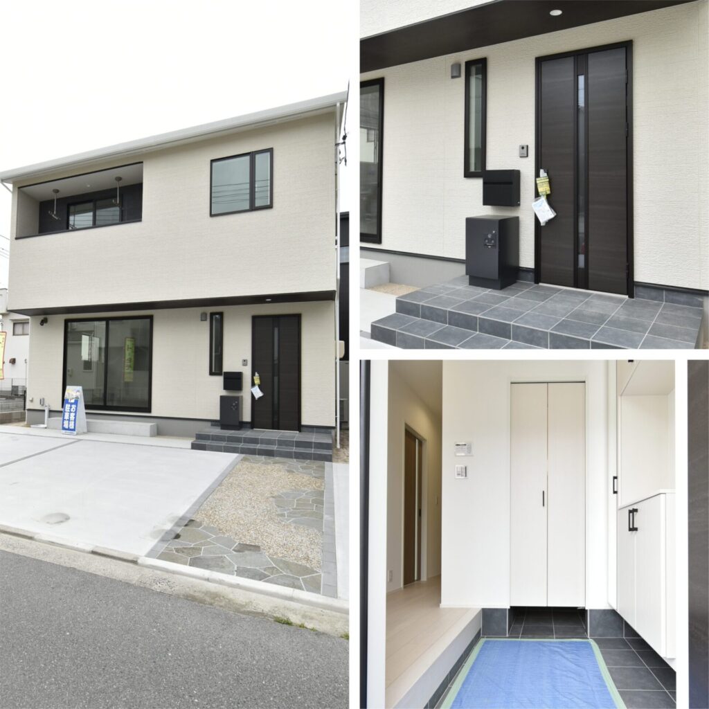 お家に到着しました。見ていきましょう。玄関横には立派な宅配ボックスが設置してありました。軒下となるため、雨の日でも荷物の取り出しがラクに行えます。