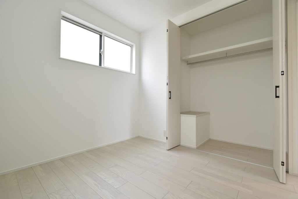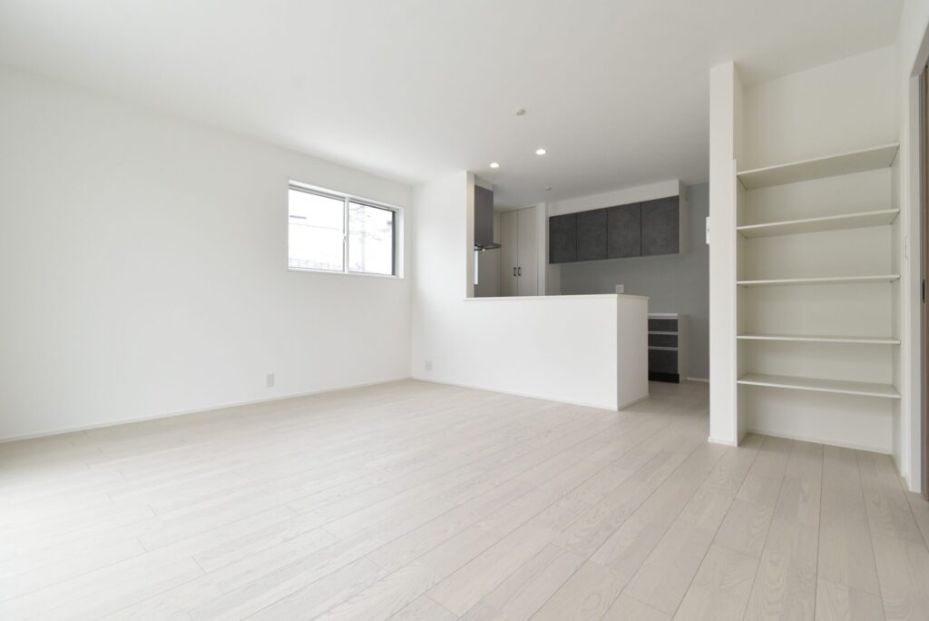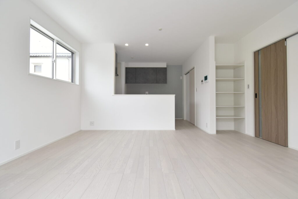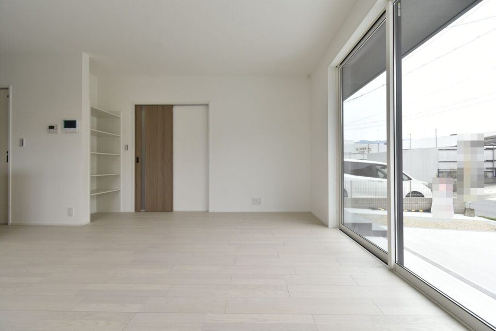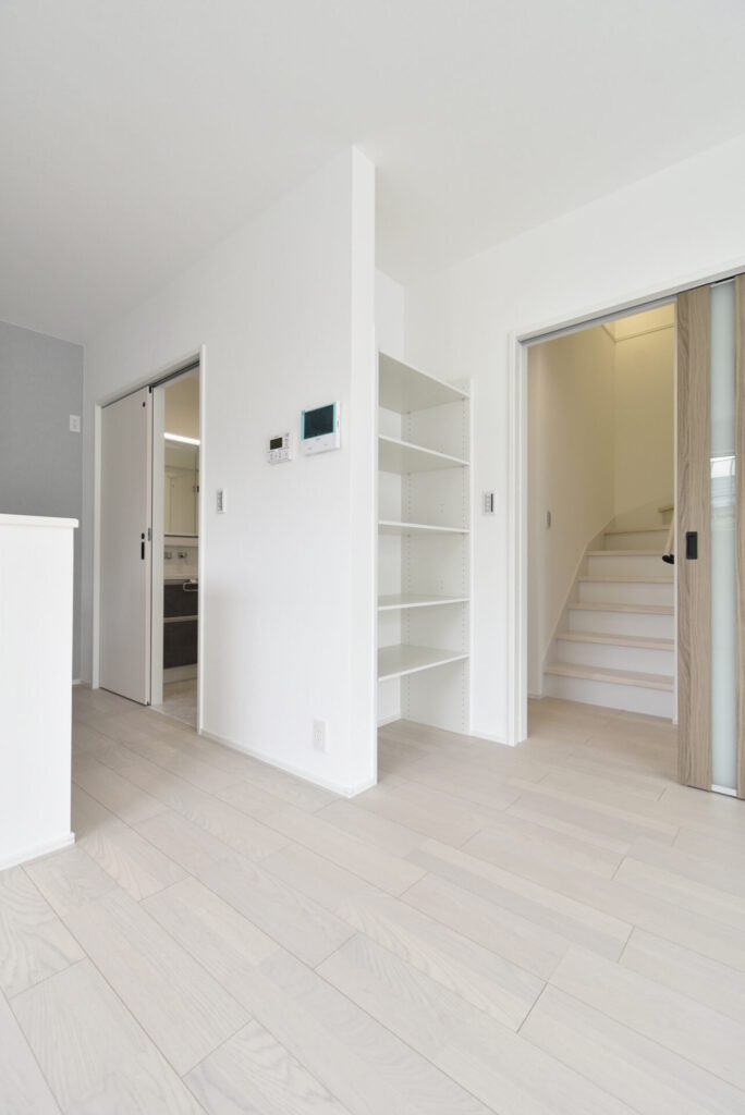 リビングの掃き出し窓は、通常のモノよりも大きく、開放感がありました。またLDK入り口横に、リビング収納棚が設置してありました。家族が共有して使用する文具、爪切り、絆創膏などの日用雑貨など、誰が見てもわかる位置にまとめると、みんなが手に取りやすくなり元の位置に戻しやすくなります。