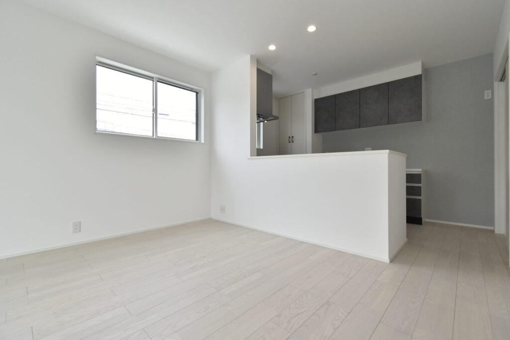 キッチン奥からの一枚。一直線上には水回りがあります。