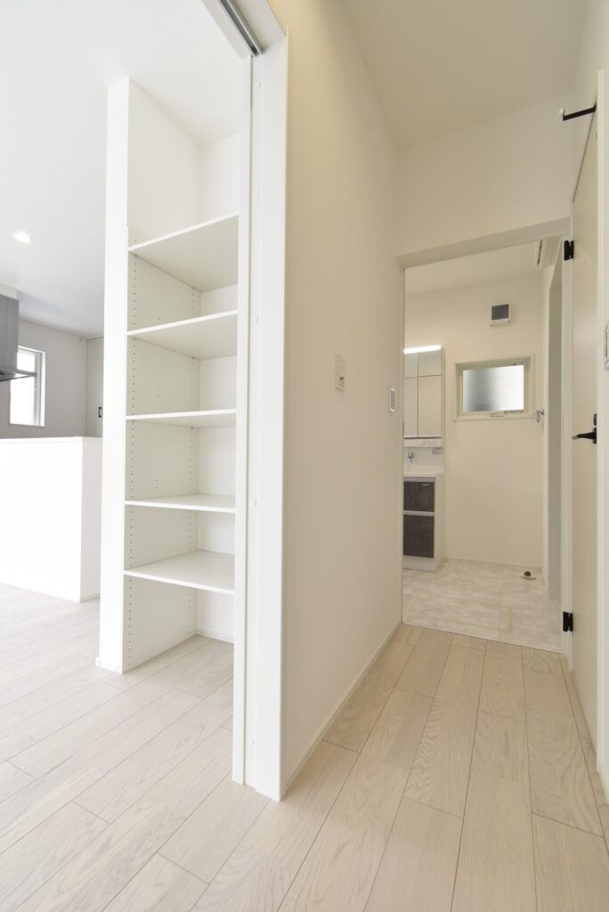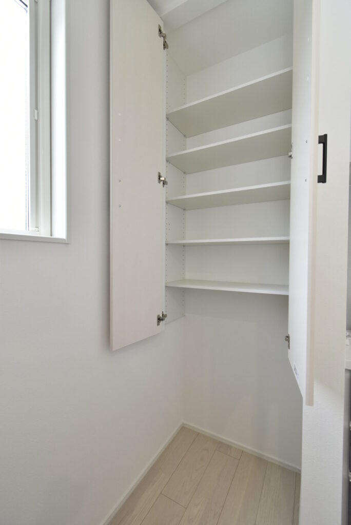 こちらはパントリー収納。下段はオープンタイプとなっており、ゴミ場スペースとしても使いやすそう。
