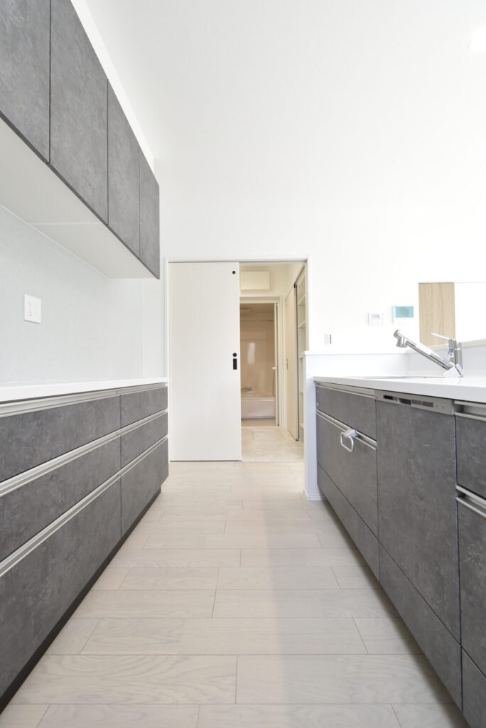 キッチン横に水回りがあることで、料理・洗濯家事の同時進行が可能に。また子供たちの入浴の際は、キッチンに居ながら着替え等の見守りがしやすいのも、良い点ですね。