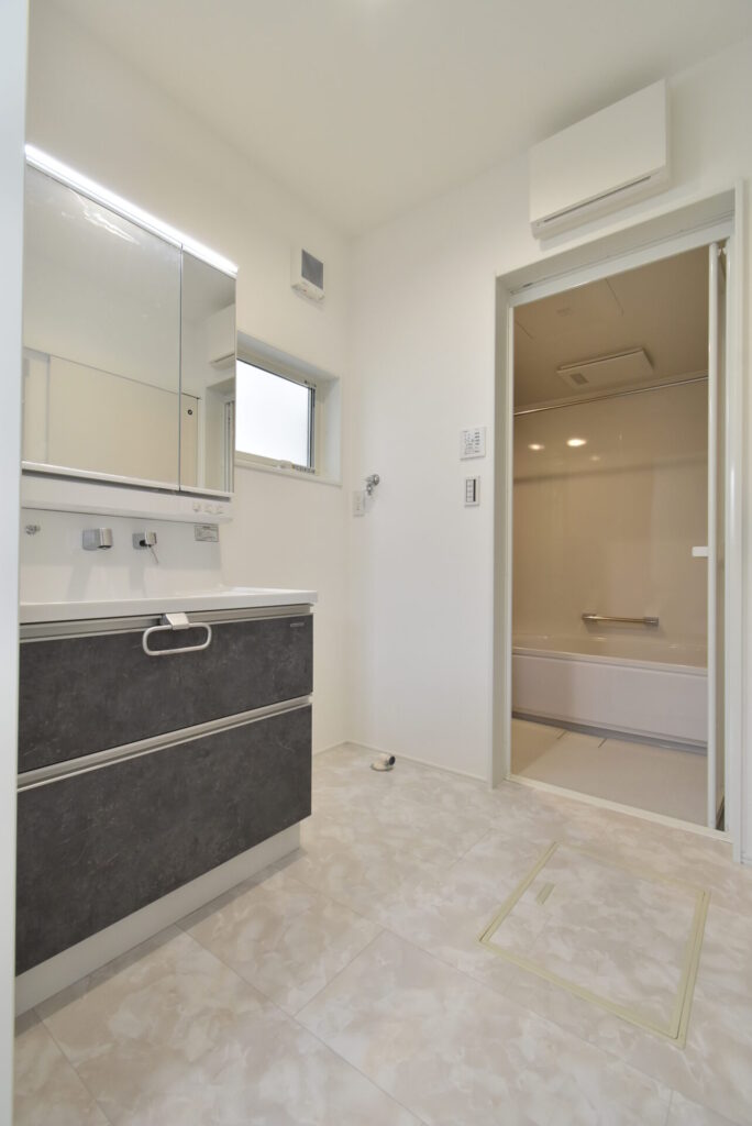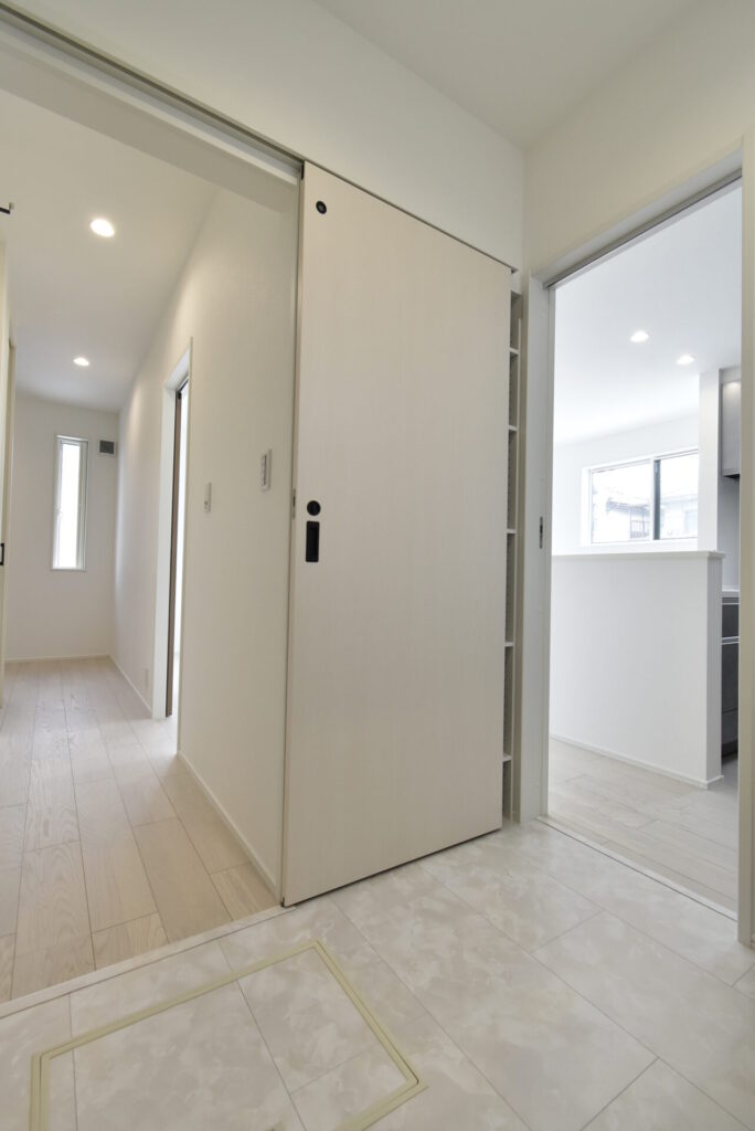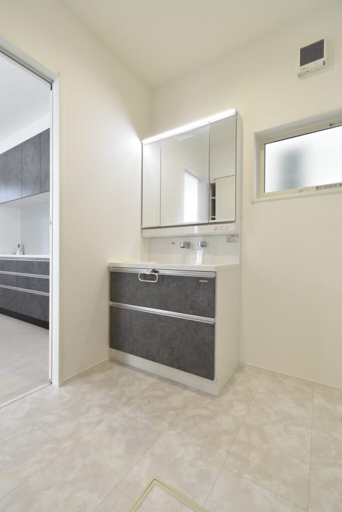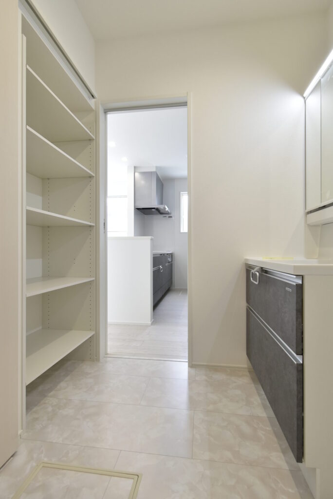玄関からリビングを通らずに洗面室へ移動できるこの動線は、公園遊び後や旦那さんのお仕事後、とりあえず洗面室で着替えや手洗いを済ませられます♪リビングに砂や菌の侵入を防げます。